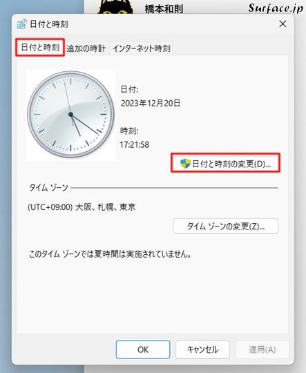 [日付と時刻]タブの[日付と時刻の変更]をクリックします。
